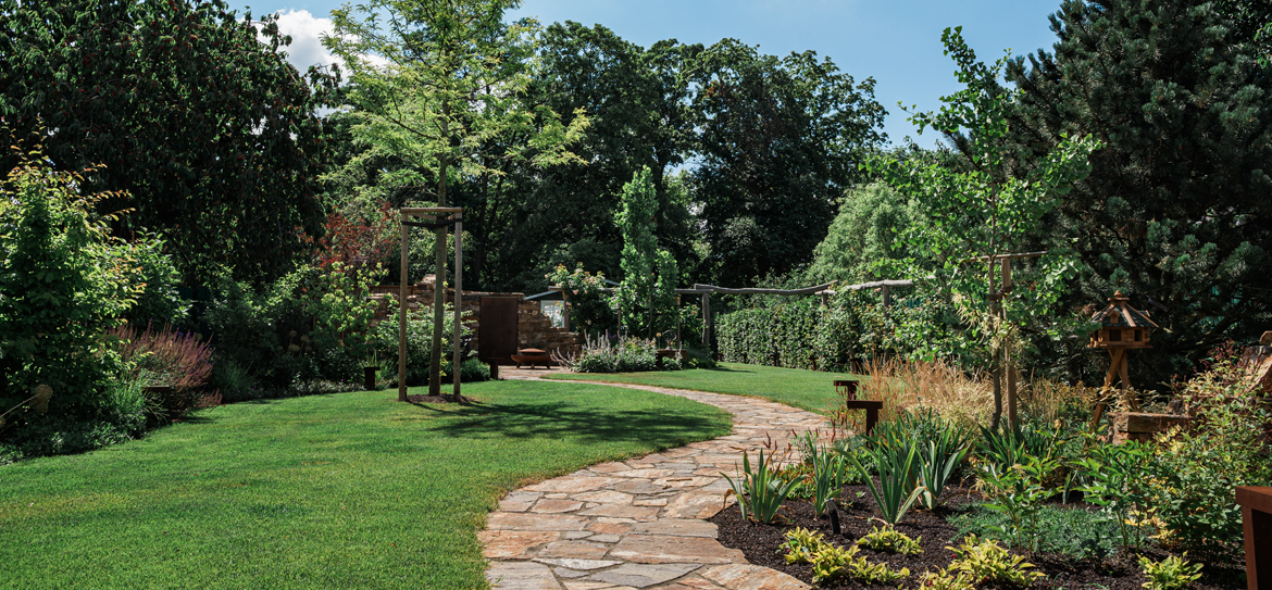 Bei diesem Projekt entstand ein Garten im Stil eines farbenfrohen Landhaus-Cottage-Gartens. Großgehölze sorgen für mehr Vielfalt und geben der Natur zusätzlichen Raum. Für Mauern und Wege wurde hochwertiger Hartgneis aus Österreich verwendet – ein langlebiges Naturmaterial mit besonderer Ausstrahlung.