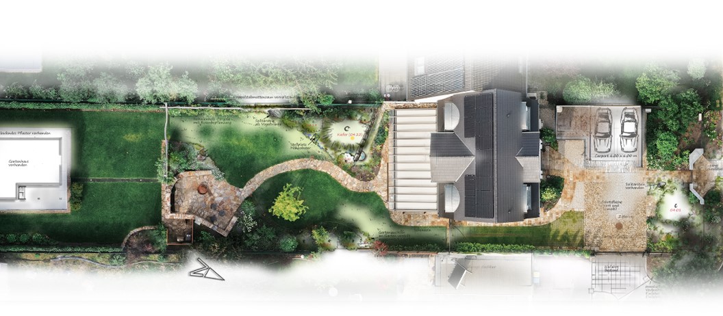 Der Vorgarten bietet strukturierte Stellflächen und eine einladende Gestaltung, während im hinteren Bereich Sitzplätze, Wege und Sichtschutz für eine harmonische Gartenstruktur sorgen. Ergänzt wird das Ganze durch dekorative Elemente wie Wasserspiele und eine Sonnenuhr.