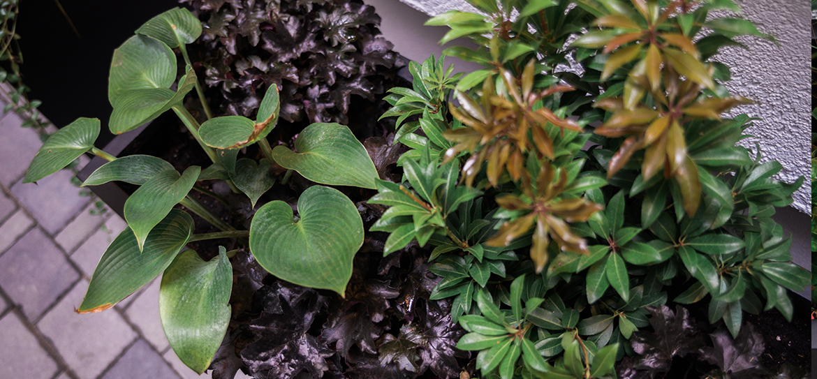 In die schwarz-anthrazitfarbenen, unterschiedlich großen Pflanztrögen aus Fiberglas haben wir u.a. Scheinbeere (Gaultheria procumbens), Funkie (Hosta), Immergrün (Vinca minor), Japan-Segge (Carex morowii) und Purpurglöckchen (Heuchera micrantha) kombiniert. Farblich wird dieses Arrangement wundervoll harmonieren und Aufmerksamkeit auf sich ziehen.